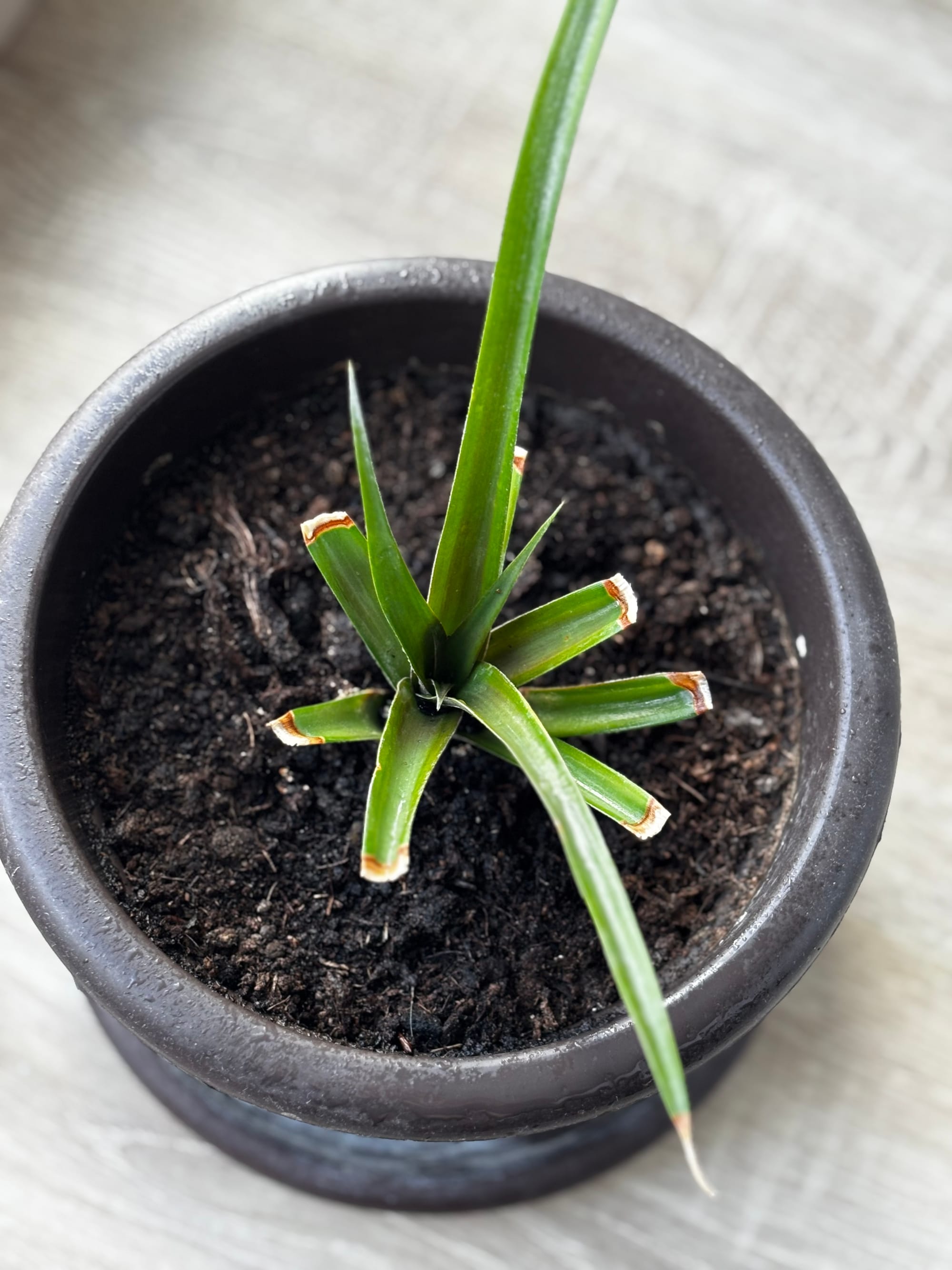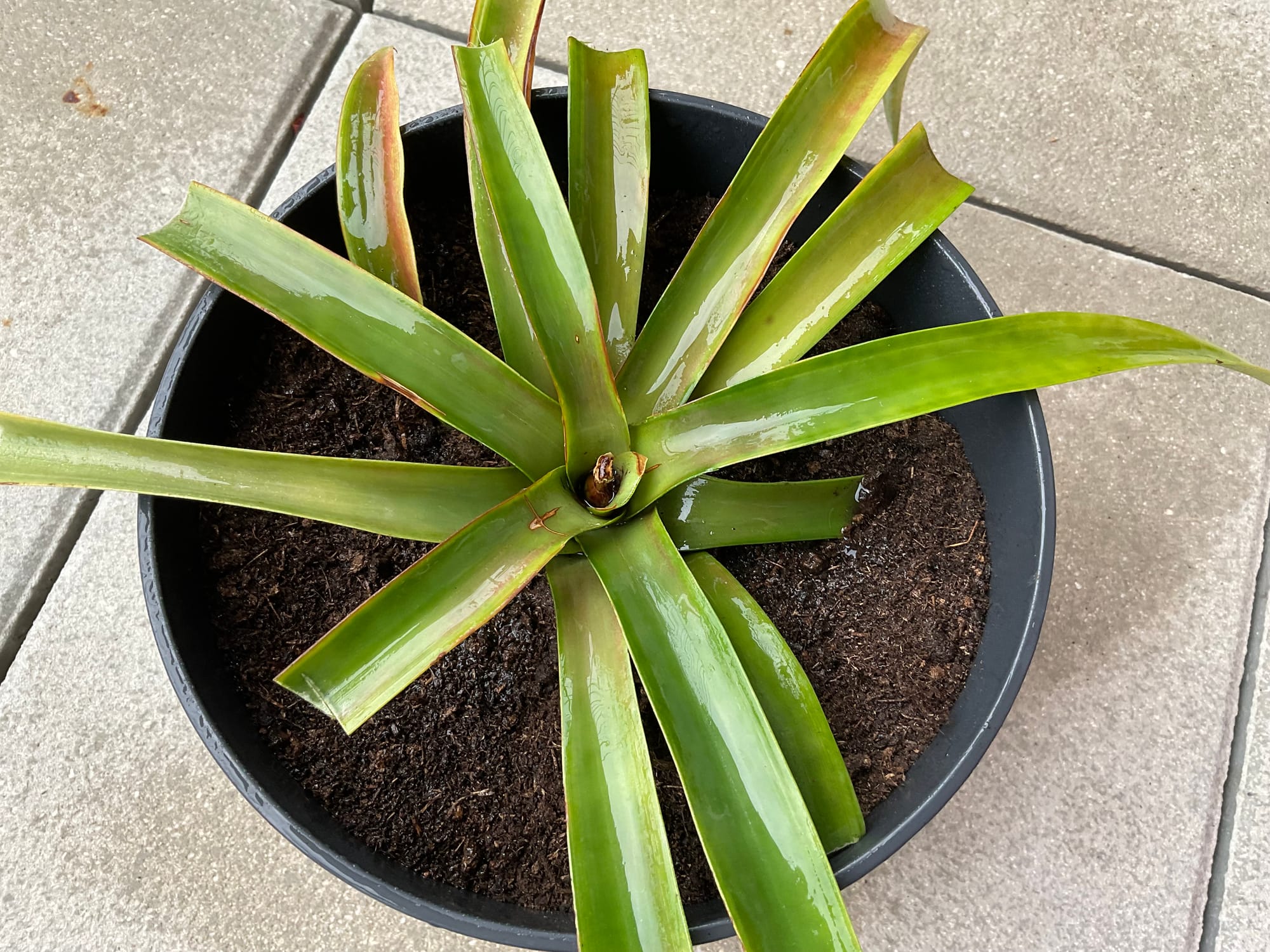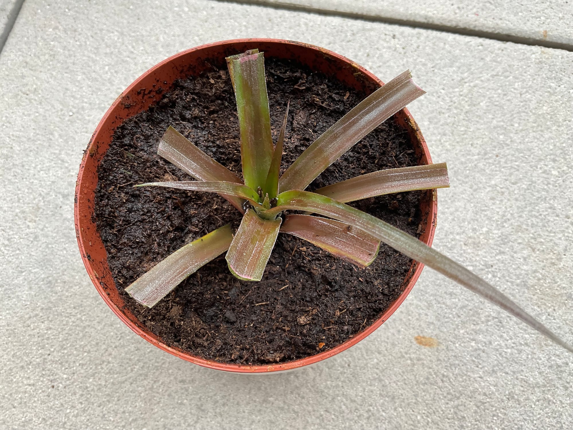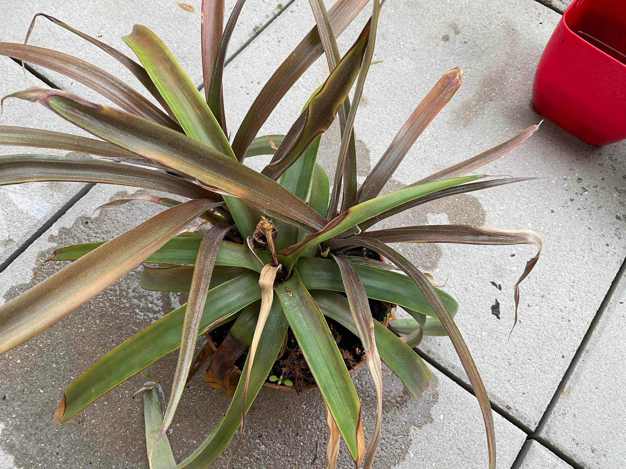 Tento ananasovník mám doma už nějakou dobu, ale přiznám se, že jsem se o něj příliš nezajímala od doby, co jsem sklidila "ananas". Když jsem si totiž rostlinu přivezla domů, měla již plod, který potřeboval nějaký čas k dozrání. V mém případě jsem nebyla úspěšná a plod nakonec nedozrál. Ananasovník si od té doby žil svým vlastním životem. Až jednou v létě jsem ho umístila na terasu a podle jeho reakce to nebyla ta nejlepší volba...