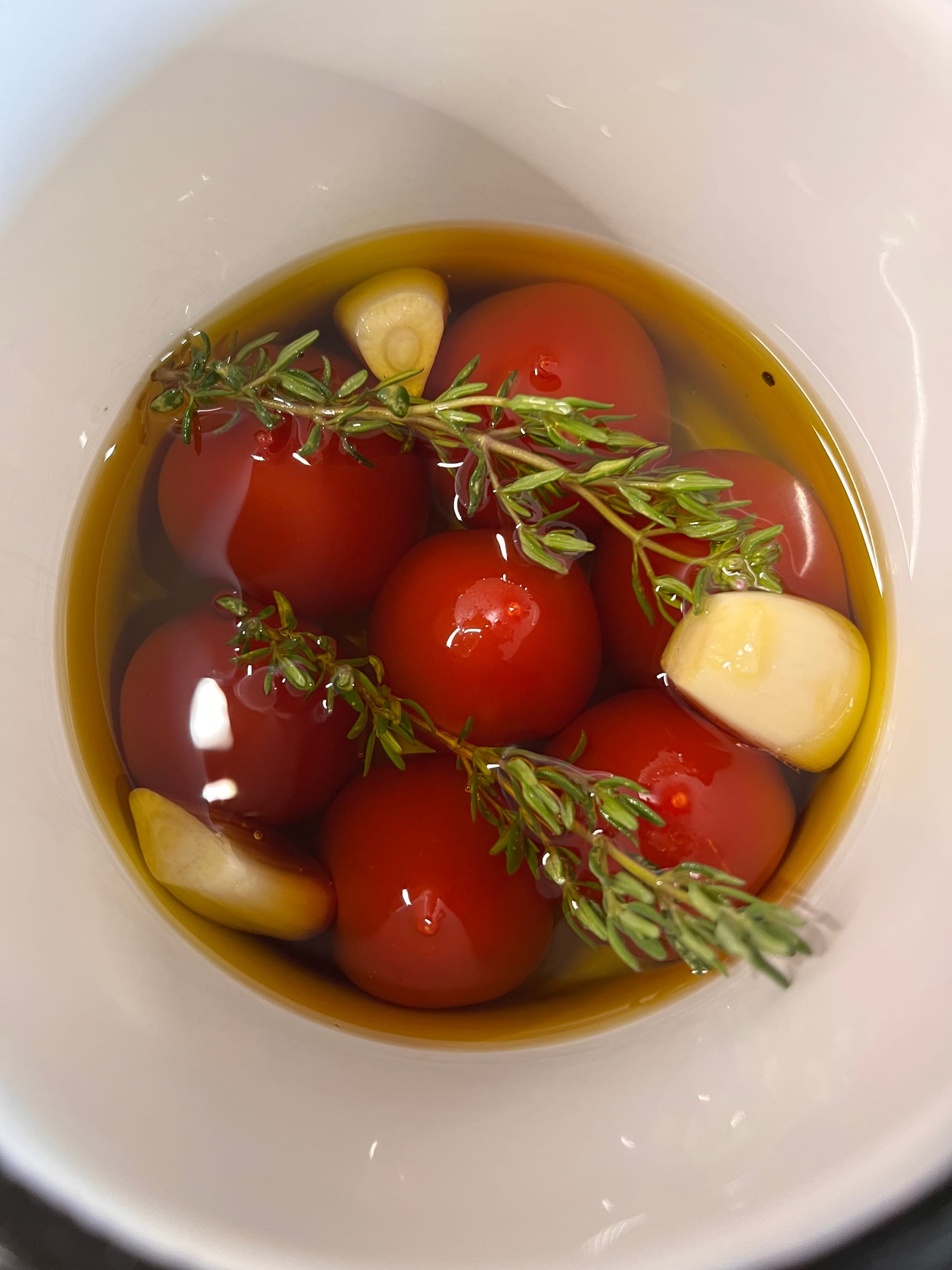 Do mezer přidáme očištěné stroužky česneku a snítky tymiánu a rozmarýnu. Celé zalejeme olejem - tak aby nic nekoukalo ven. Dáme na nejmenší možný plamen, tak aby olej jen lehce bublal a necháme takto dokud není česnek úplně meký a lehce zlatavý. Rajčata a česnek dáme stranou.