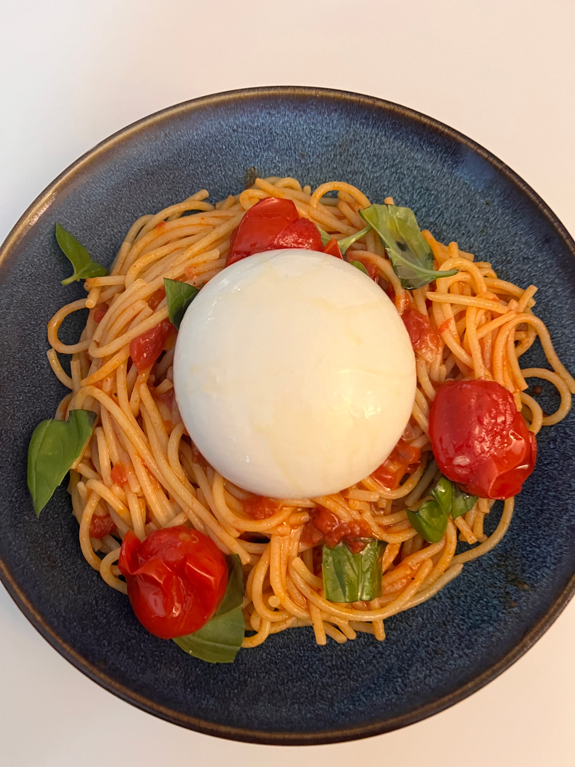 Servírujeme do hlubokého talíře a dozdobíme zbytkem rajčátek, česnekem, bazalkou a do prostřed pasty uděláme ďoulek, do kterého posadíme burratu. Na finish dáme trošku rajčatového oleje.